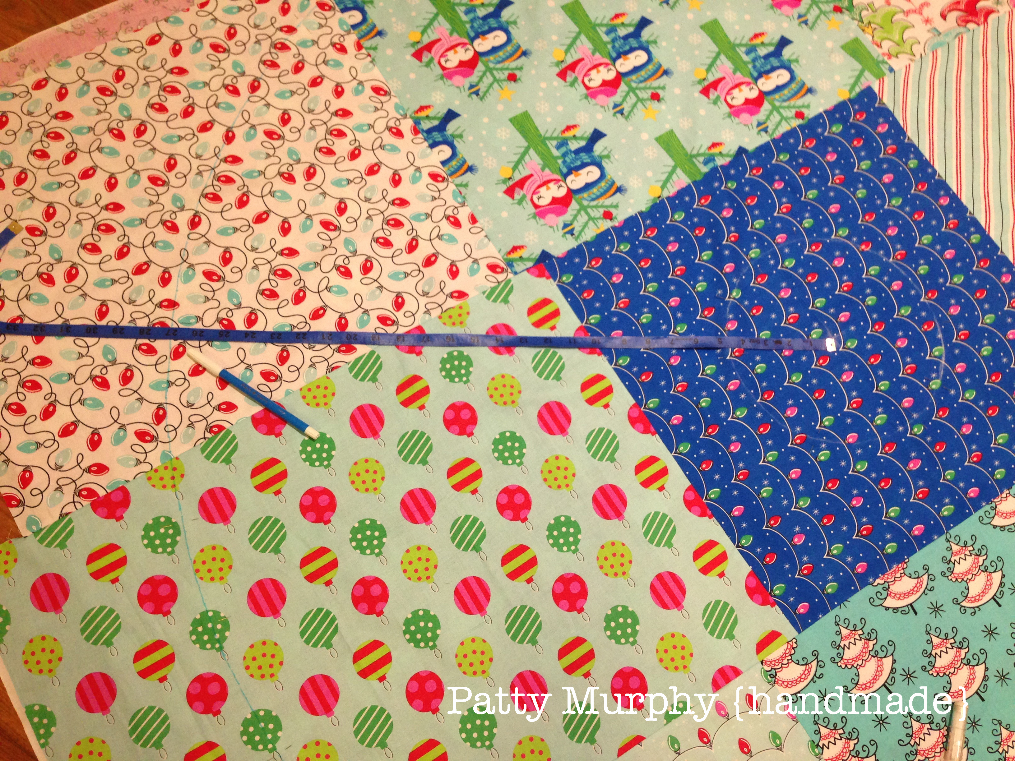 Determine fabric placement for the top of your tree skirt. I put the fat quarters on my floor and played with them until I was happy with how they looked. Once you know where you want your fabrics, cut the center block 18 1/2″ square. Sew three rows of three fat quarters, then sew the rows together. The two outer rows won’t match corners with your center block. That’s okay.