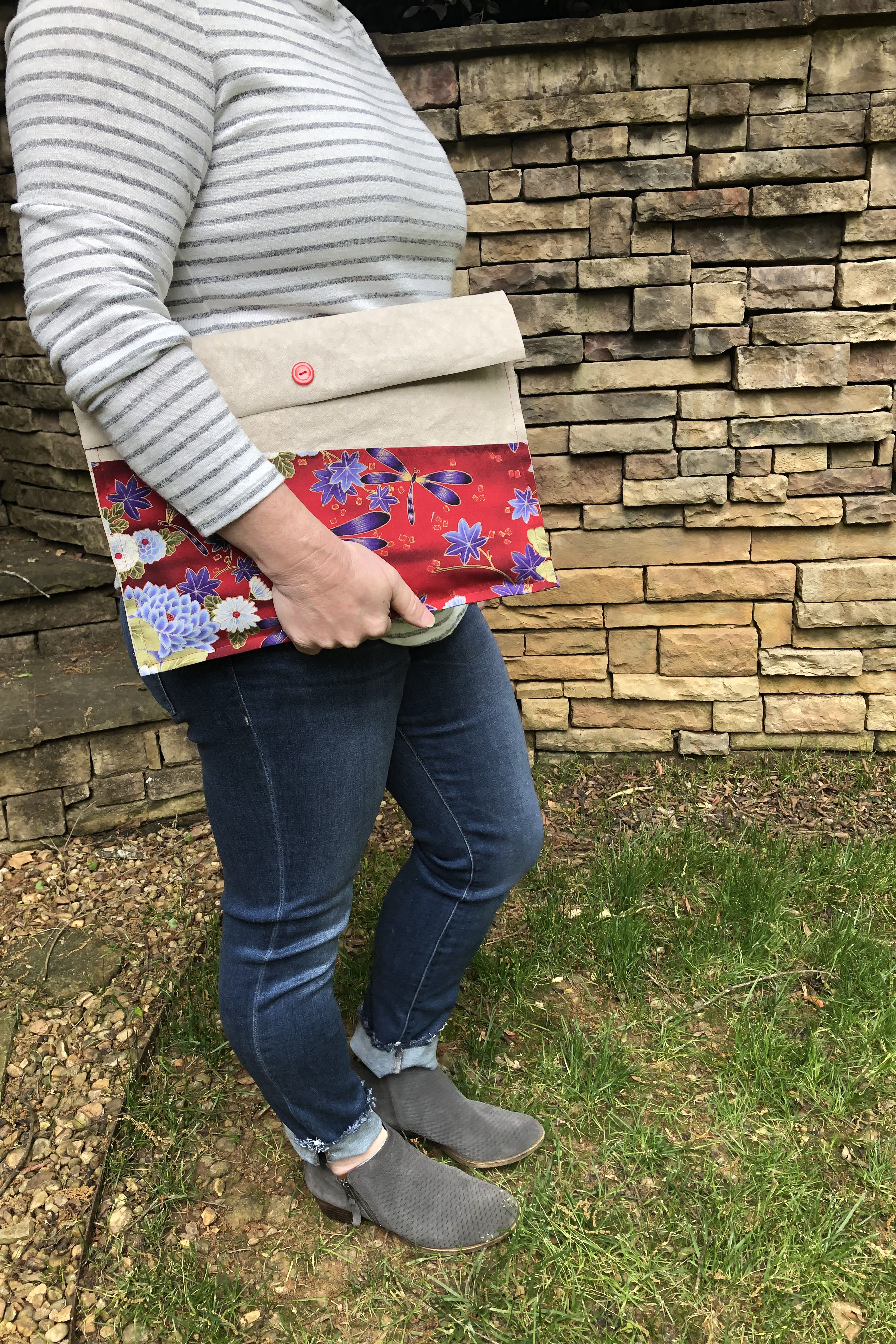 Clip the pieces together, making sure the front flap and quilted pocket are facing out.