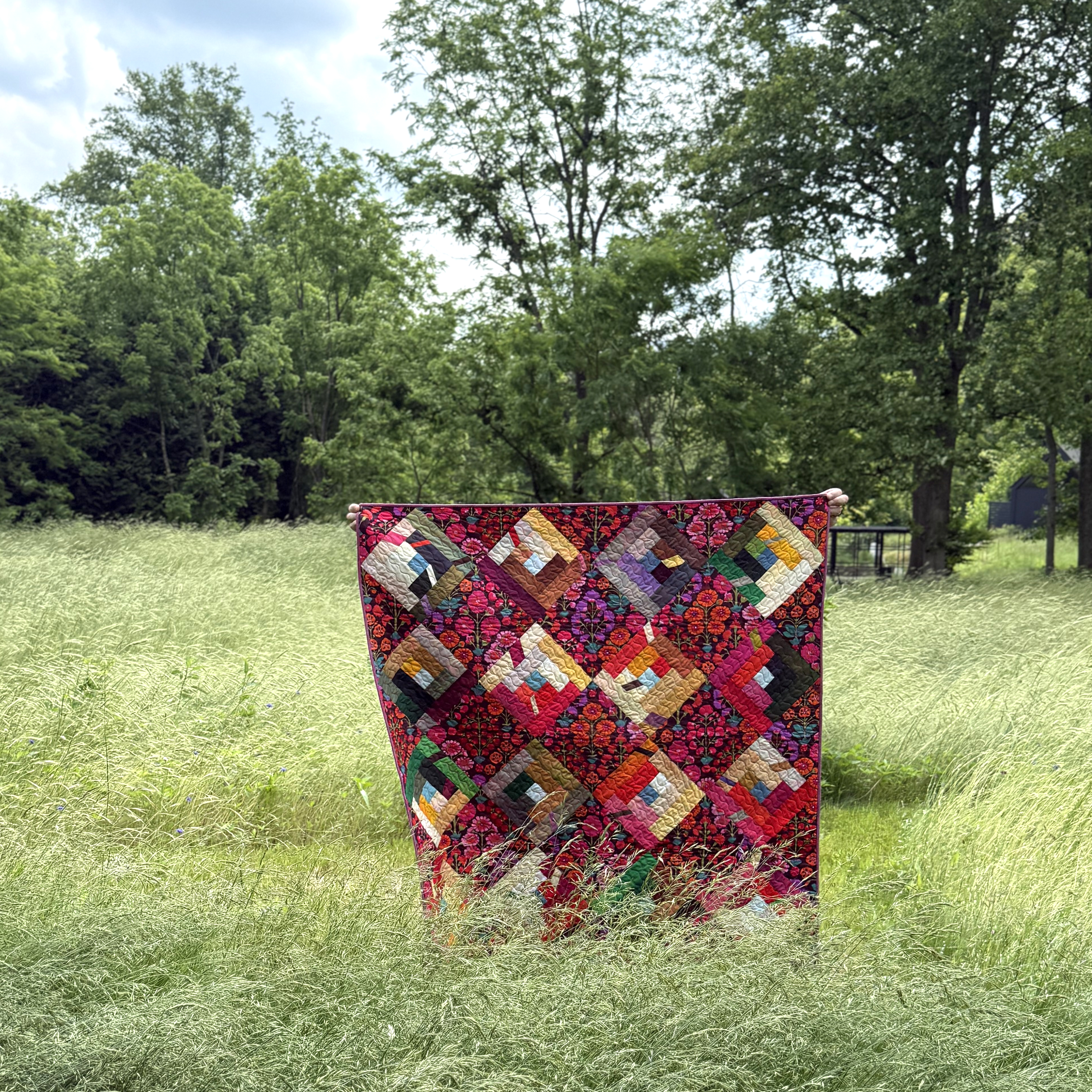 This modern take on a traditional quilt features small scraps inset the larger logs creating depth in the pieces. A bold floral brings all the colors to life in this on point quilt.